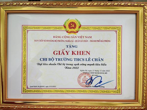 🌻 Chi bộ Trường đạt tiêu chuẩn Chi bộ trong sạch vững mạnh tiêu biểu năm 2022. 🌻Tập thể Trường THCS Lê Chân đã có thành tích xuất sắc trong phong trào thi đua yêu nước năm 2022.