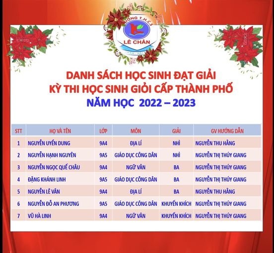 Trong kỳ thi học sinh giỏi cấp thành phố các môn văn hoá lớp 9 năm học 2022 – 2023, các em học sinh trong các đội tuyển của trường THCS Lê Chân đã đạt được những kết quả đáng khích lệ: 7/8 em tham gia thi đã đạt giải, bao gồm: 02 giải Nhì, 03 giải Ba và 02 giải Khuyến Khích.